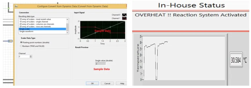 A must-have pre-process is converting data, where the temperature readings displayed in form of signal, into numeric using LabVIEW function Convert from Dynamic Data. With the converted numeric data, the Measure Temp subVI will do calculation to determine whether the current temperature is abnormal.