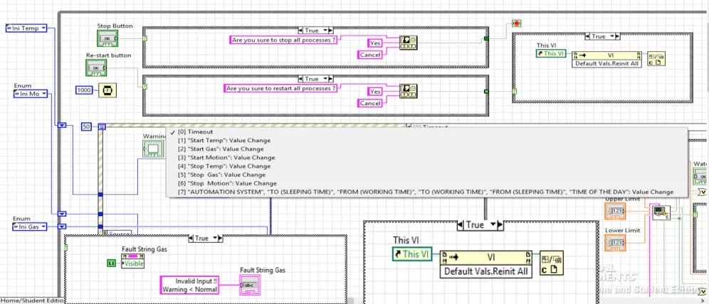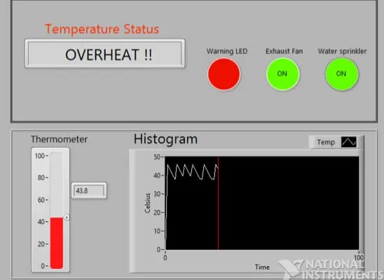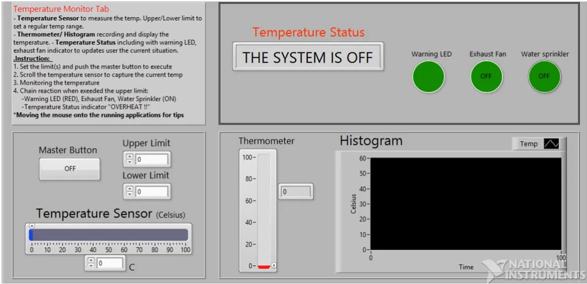 Specifically, a case structure is used to demonstrate the outcome when the exhausted fan was activated, i.e. the temperature over the upper limit. The current temperature dropped by 2 degree every cycle as indicated by the Thermometer and will only stop when the temperature measured dropped below the upper limit.