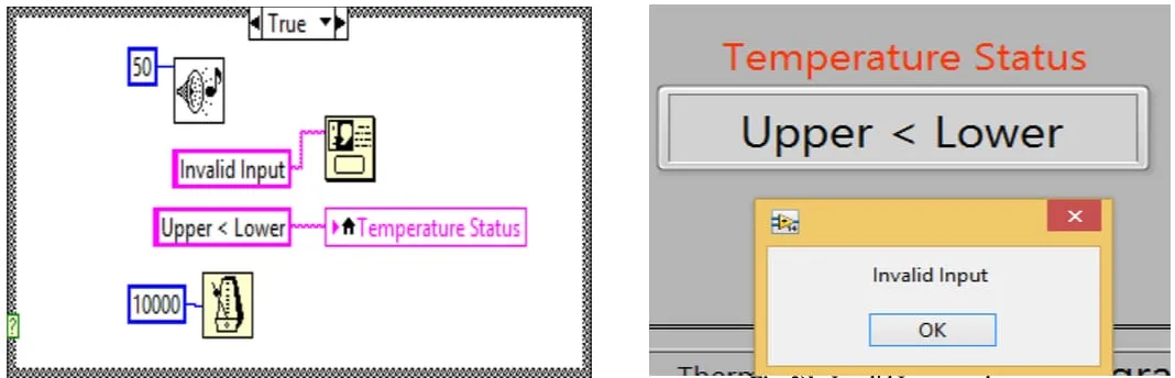 Another application using case structure is the feedback when the input for two limits is invalid (i.e. Upper Limit < Lower Limit), then the case structure will return a message Invalid Input and update the temperature status Upper < Lower to inform user the current state. A ten-second delay for user to change the values also included.